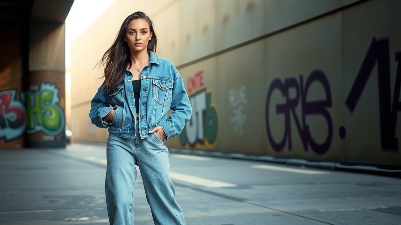 Portrait naturel d'une jeune femme en jean baggy ample et veste en denim oversize, ambiance urbaine douce avec graffiti, grain de film 35 mm subtil, peau visible, expression décontractée et confiante, baskets sur béton, style streetwear élégant vu de profil.